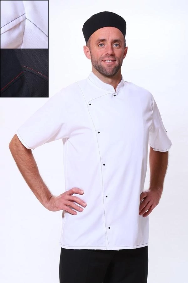 Vásárlóink egyik kedvence ez az egysoros szakácskabát. Kontrasztos dísztűzése kiemeli a szabásvonalát. Kényelmes, nem szűkített fazon. A hátán szellőzős anyagbetétek teszik még kellemesebbé a viselését. Az rugalmas hátbetéteknek köszönhetően szabad mozgást biztosít munka közben. Vevőink igényeit szem előtt tartva patenttal záródik. Ujján praktikus tollzsebbel készítjük.