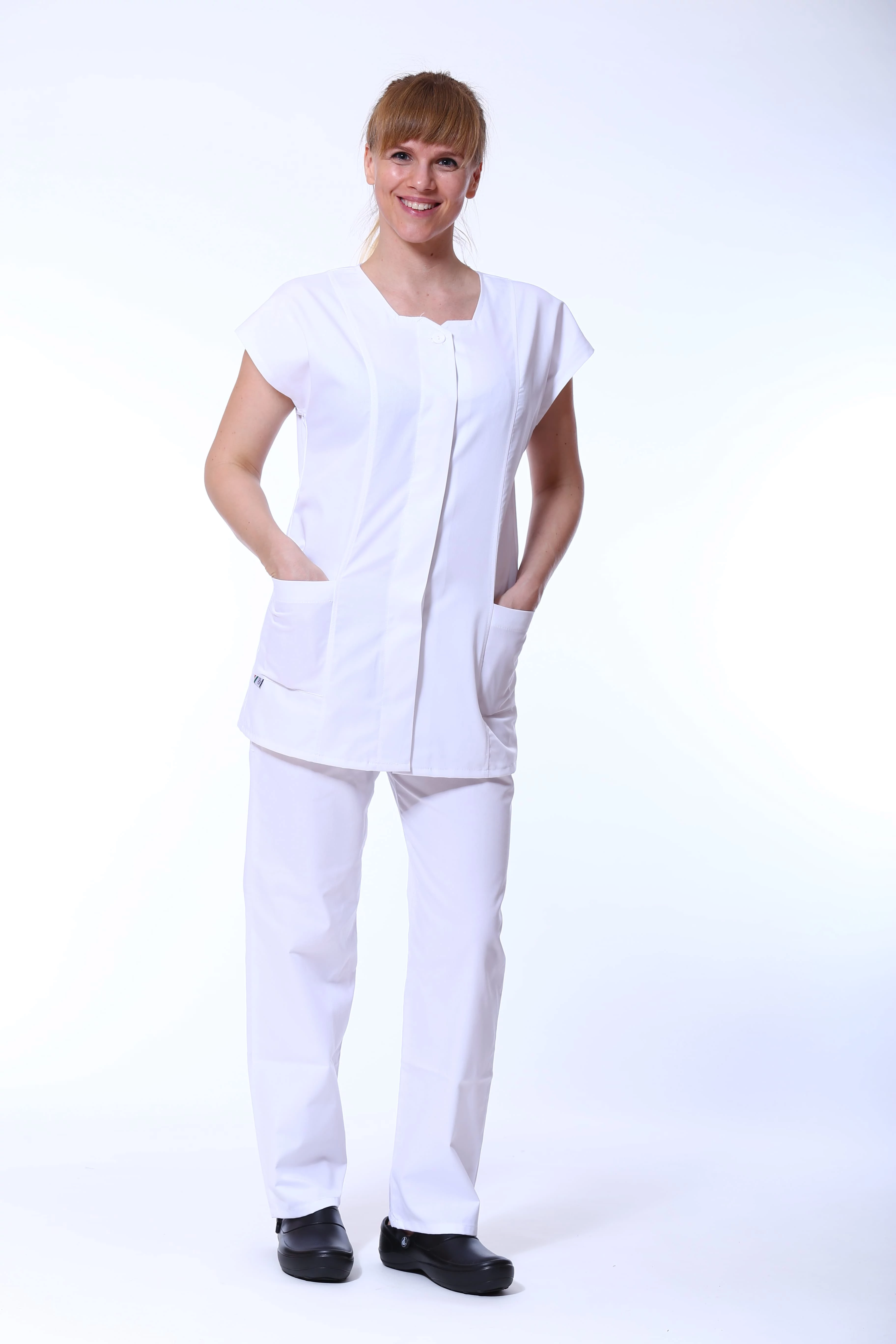A K fazonú tunika japán ujjai nem korlátozzák a karok mozgását. Bő nyakkivágása ideális azoknak, akiket zavar a munkaruha gallérja. Csak a legfelső gombja látszik, a többi rejtve marad a szemek elől. Szabása kiemeli a nőies vonalakat, miközben szabad mozgást enged munka közben.
